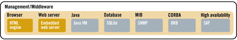 Provided by QNX Software Systems and a growing ecosystem, this layer provides key services including Simple Network Management Protocol (SNMP), service availability forum HA, Corba, and web services.